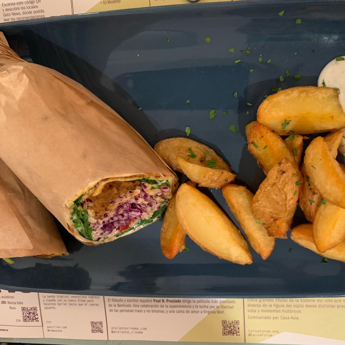 Heura y setas asadas y condimentadas, pimiento rojo asado, quinoa, espinacas, veganesa casera y lombarda. En tortilla de trigo, tipo burrito. Con patatas fritas caseras. #vegan #veganisnotscary muy rico