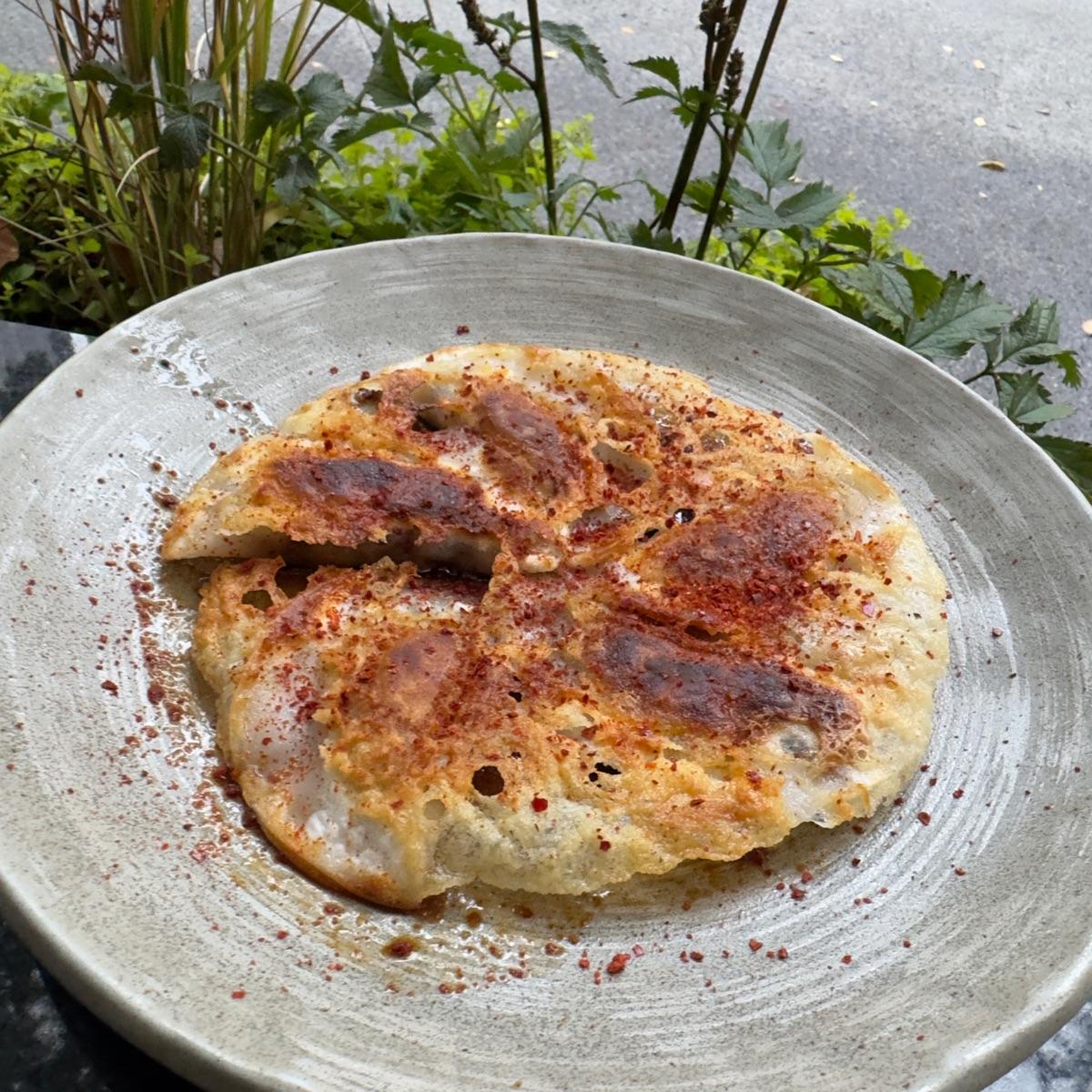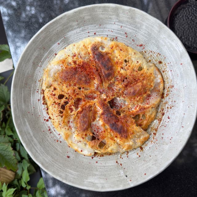 Crispy Gyoza 🥟 is a delicious and unique dish! I want to say there are about 5 or 6 dumplings filled with cabbage, carrot, cilantro, mushroom, chili soy and all lightly fried into a sort of pancake shape! A definite must try! So so tasty 😋!!