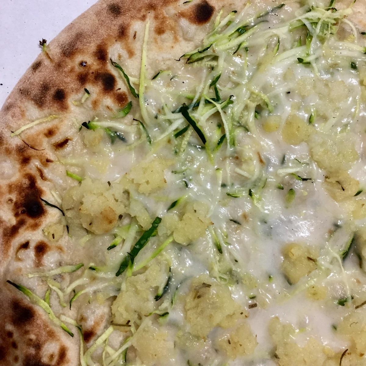 Pizza consegnata a domicilio con zucchine, mozzarella vegetale e aggiunta di patate. Buona e ricca di condimento! Sempre un’ottima alternativa quando non si ha nessuna voglia di cucinare!🤪