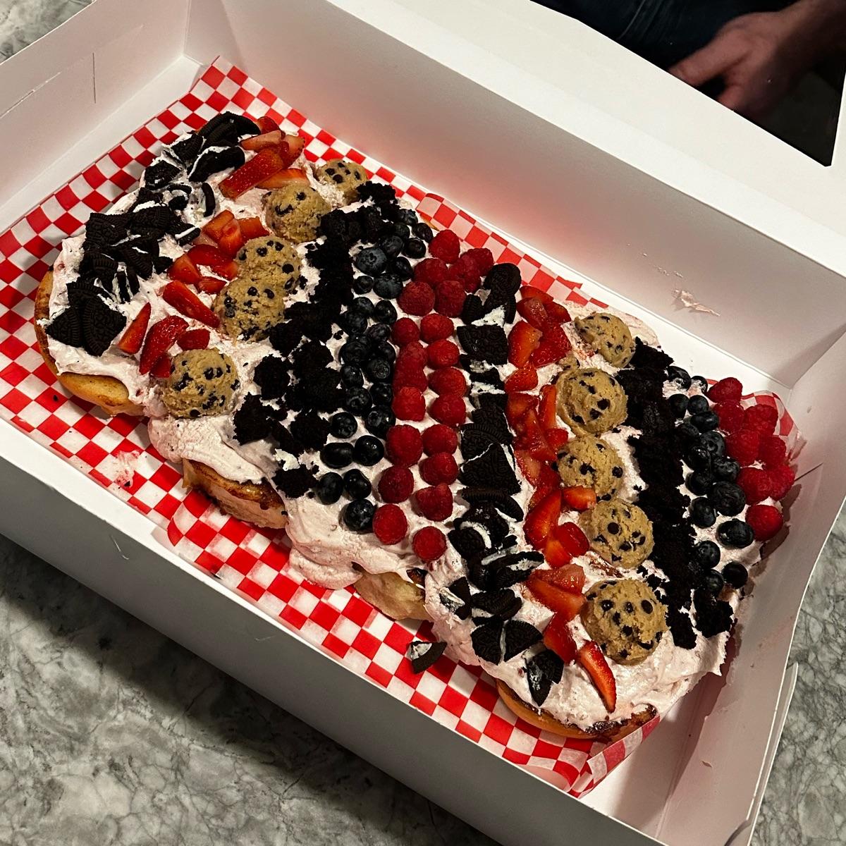 We chose raspberry frosting, blueberries, strawberries, Oreos, cookie dough, and brownie bits. They threw in raspberries in the middle. I loved the mix of fruit and chocolate 🫐 🍓 🍪