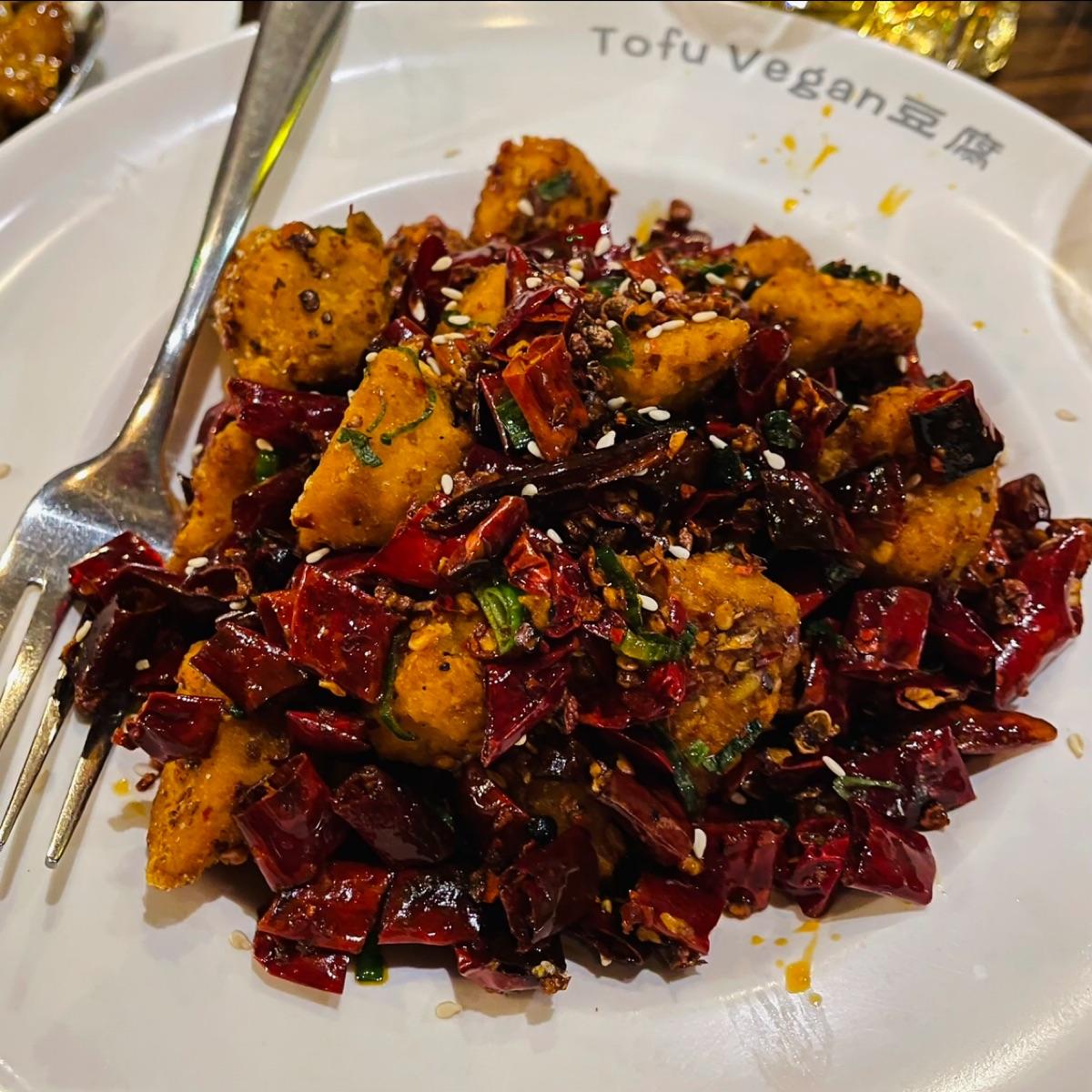 The mock chicken they use here is really good, though this wasn’t my favourite dish of the night - I wasn’t expecting the chillies to be dried! They were seasoned nicely but quite tough/dry/chewy to eat, especially as it wasn’t a saucy dish #chinesefood #chinese #veganlondon #londoneats #london #veganchicken #chilli #veganmeat #fakemeat #mockmeat