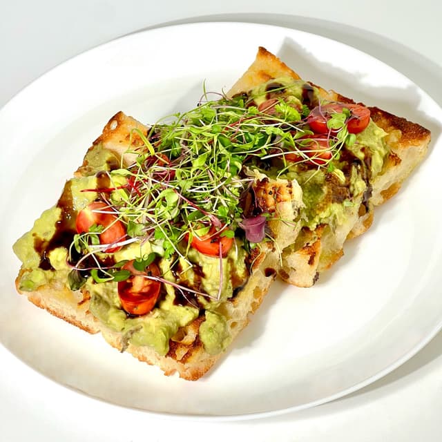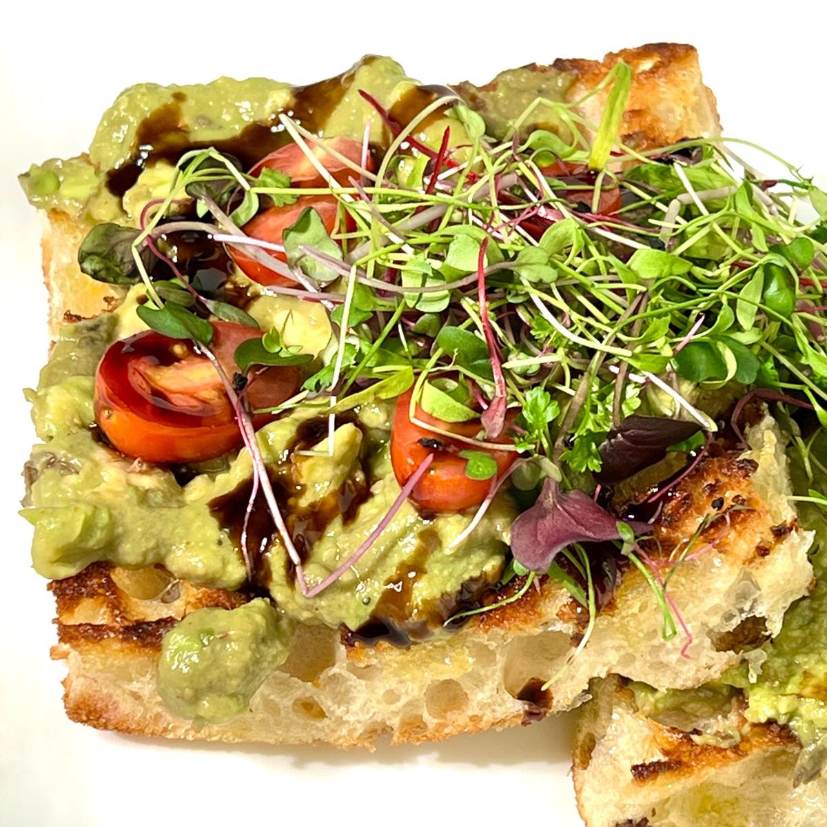 With luscious avocado mash, balsamic drizzle, grape tomatoes, and micro greens on toasted focaccia bread, this next level avocado toast was fabulous.