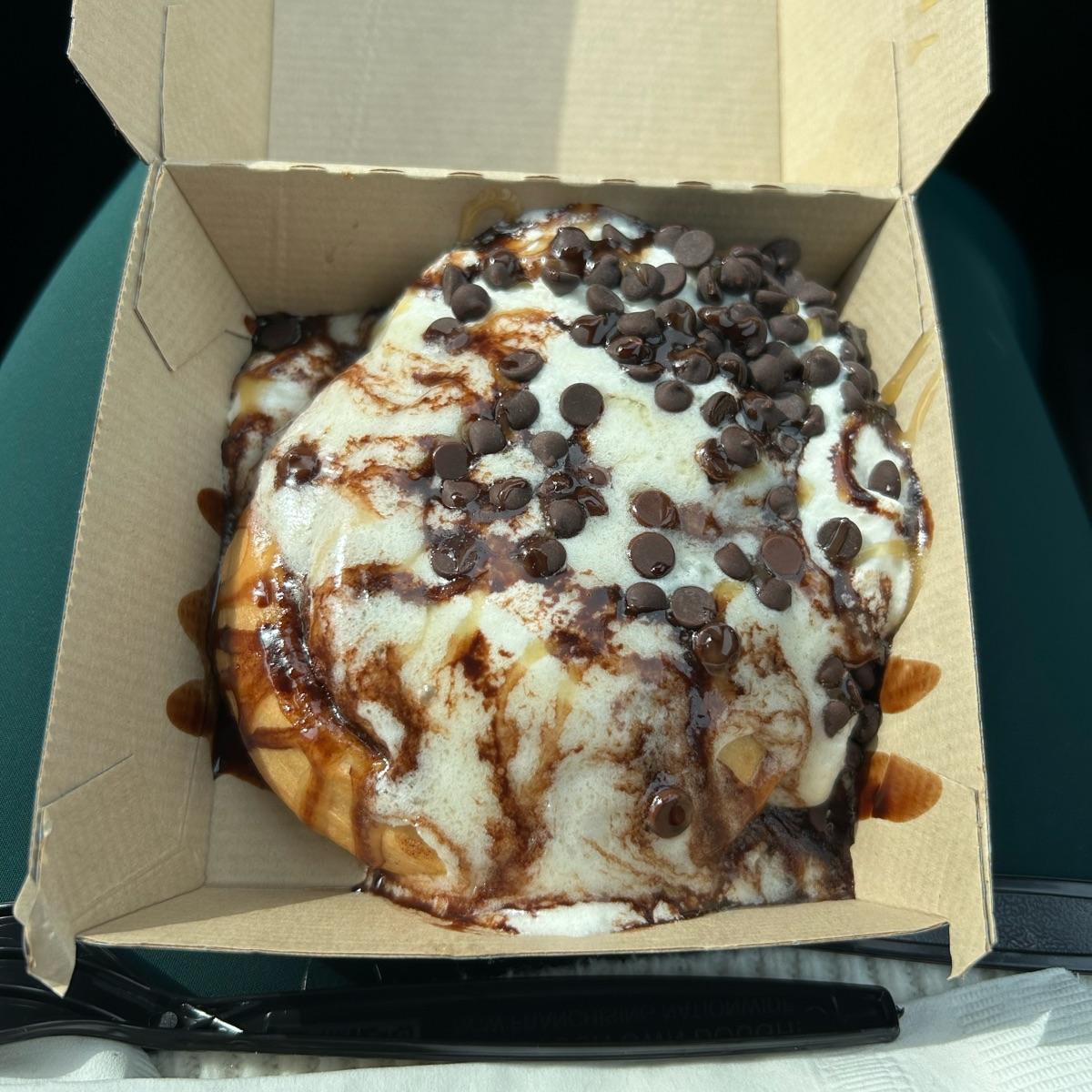 I got the cream cheese frosting, chocolate chips, chocolate sauce, and caramel sauce. It tasted so delicious and rich! Everything at Cinnaholic is vegan!