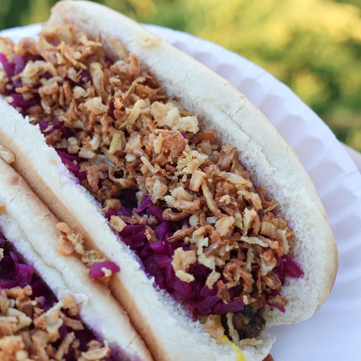 Note: the pickled onion and cabbage no longer automatically come on the Veggie dog. You have to add it additionally.