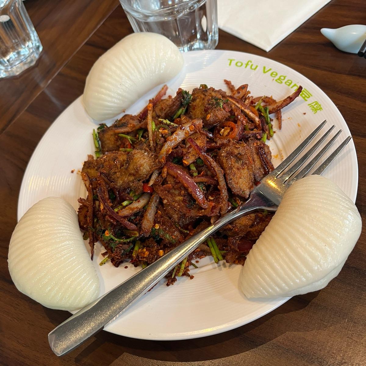 🇨🇳 Tofu Vegan is a Chinese #allveganrestaurant and chain with a branch in East London which gets rave reviews. This was our favorite of the dishes we tried here. It was so heavy on the cumin which is why many of us liked it. It’s listed as one 🌶️chilli for spice but I think it’s more like two chillis. 🥵It’s got significant heat. It was a good portion and we ordered extra Bao buns so we could all have one. It was £13.80. Our French 🇫🇷guest said it was his favorite dish of the whole day when we ate our way through the vegan 🌱places in the neighborhood. They were very accommodating when we turned up as 6 without a reservation. #veganlondon #londoneats #saveveganrestaurants #veganrestaurant #veganmeat #chinesefood #chinese