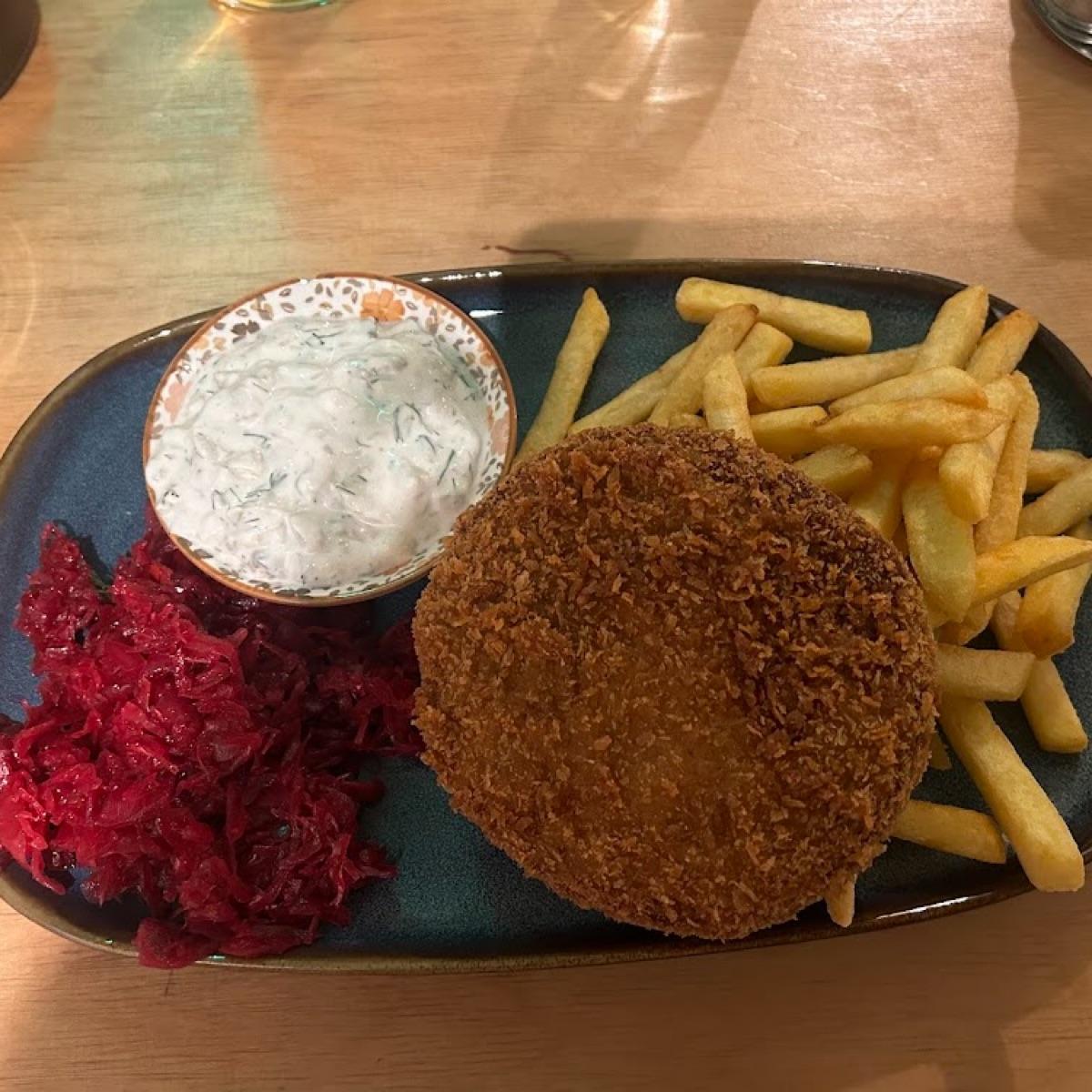 Accompanying the cutlet are crisp and golden #fries, perfectly salted 🍟 To add a burst of color and tanginess, the dish is served with a red pickled cabbage salad, made from thinly sliced red cabbage marinated in a tangy #vinegar dressing. The cabbage salad offers a refreshing contrast. Completing it is a dollop of creamy tartare sauce, adding a luscious richness and a hint of tanginess that ties the dish together beautifully. The tartare sauce is the perfect accompaniment to the fishless cutlet, and makes it taste more like fish!