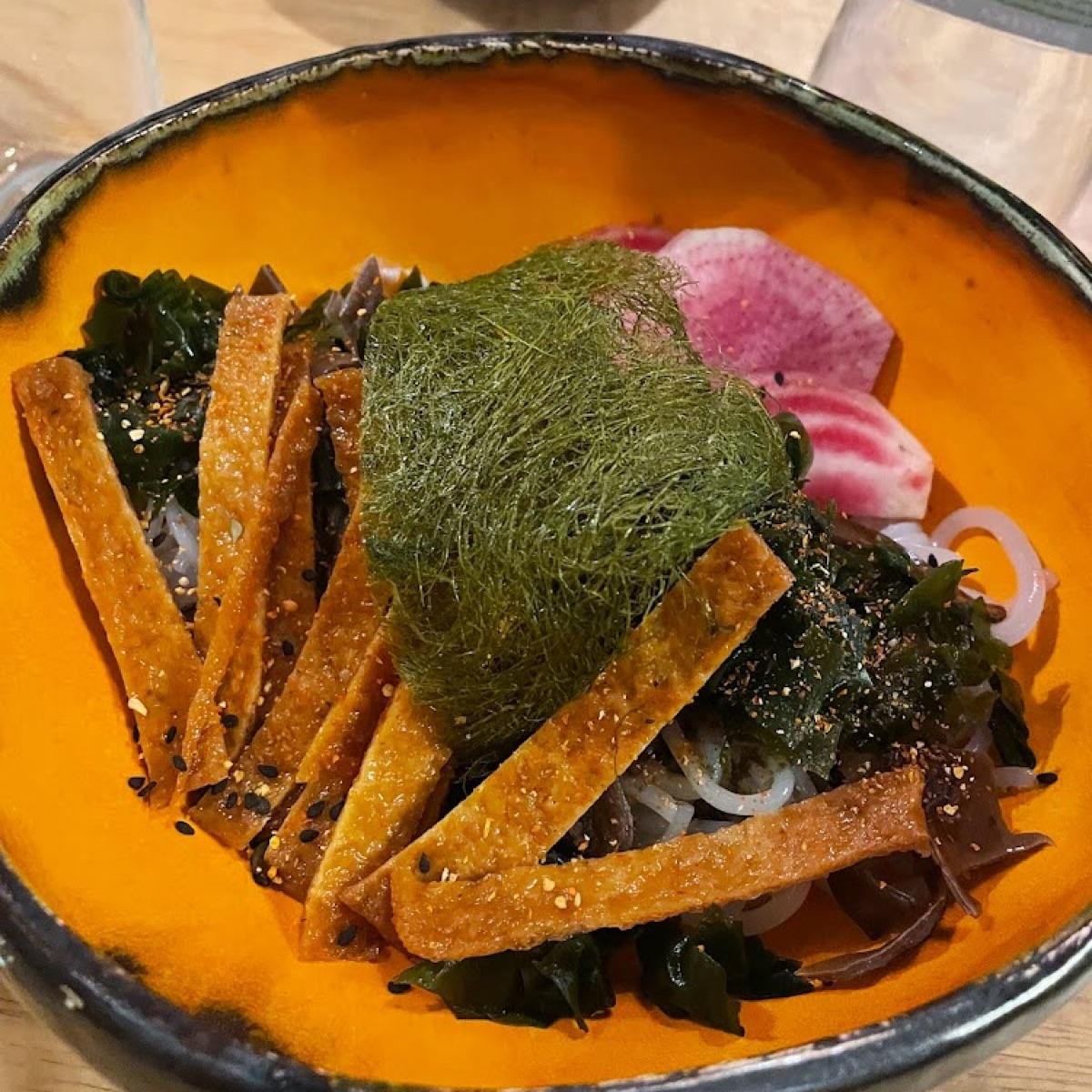 What a refreshing salad 🥗 bursting with flavors and textures inspired by the ocean 🌊 This #salad features glass #noodles at the base, topped with tender #tofu #inari strips, all dressed in a savory #nori dressing and seasoned with the subtle heat of #togarashi spices 🌊