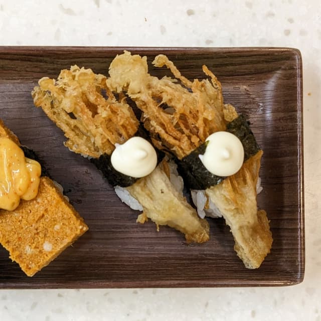 Crispy enoki mushroom tempura nigiri topped with a dollop of creamy vegan mayonnaise~ 🍄 I remember liking the vegetable tempura at Sauté San, this was pretty good too hehe! I believe there's also a Pumpkin Tempura Nigiri recently introduced in Feb 2024, though I haven't tried it. Always appreciate dishes made with natural ingredients compared to mock meat! 💚 (Allium-free, $3.80) #sgvegan #japanesefood #sushi #alliumfree #wholefoodplantbased #wfpb