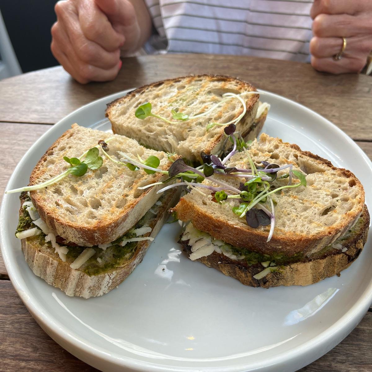 Beyond delicious Caprese sandwich from Wildsprout. Vegan mozzarella, tomato and basil pesto on your choice of bread for only R98 🌱