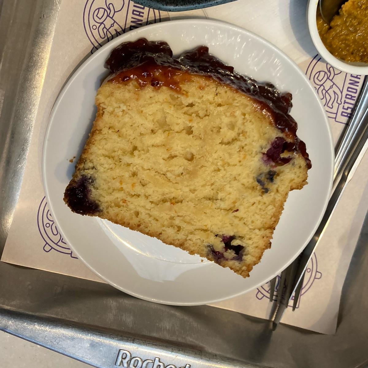 O bolo de tangerina 🍊 com mirtilo 🫐 do Astronauta estava divino! Muito saboroso e macio. Veio com uma cobertura de geleia de morango 🍓 que também estava deliciosa!