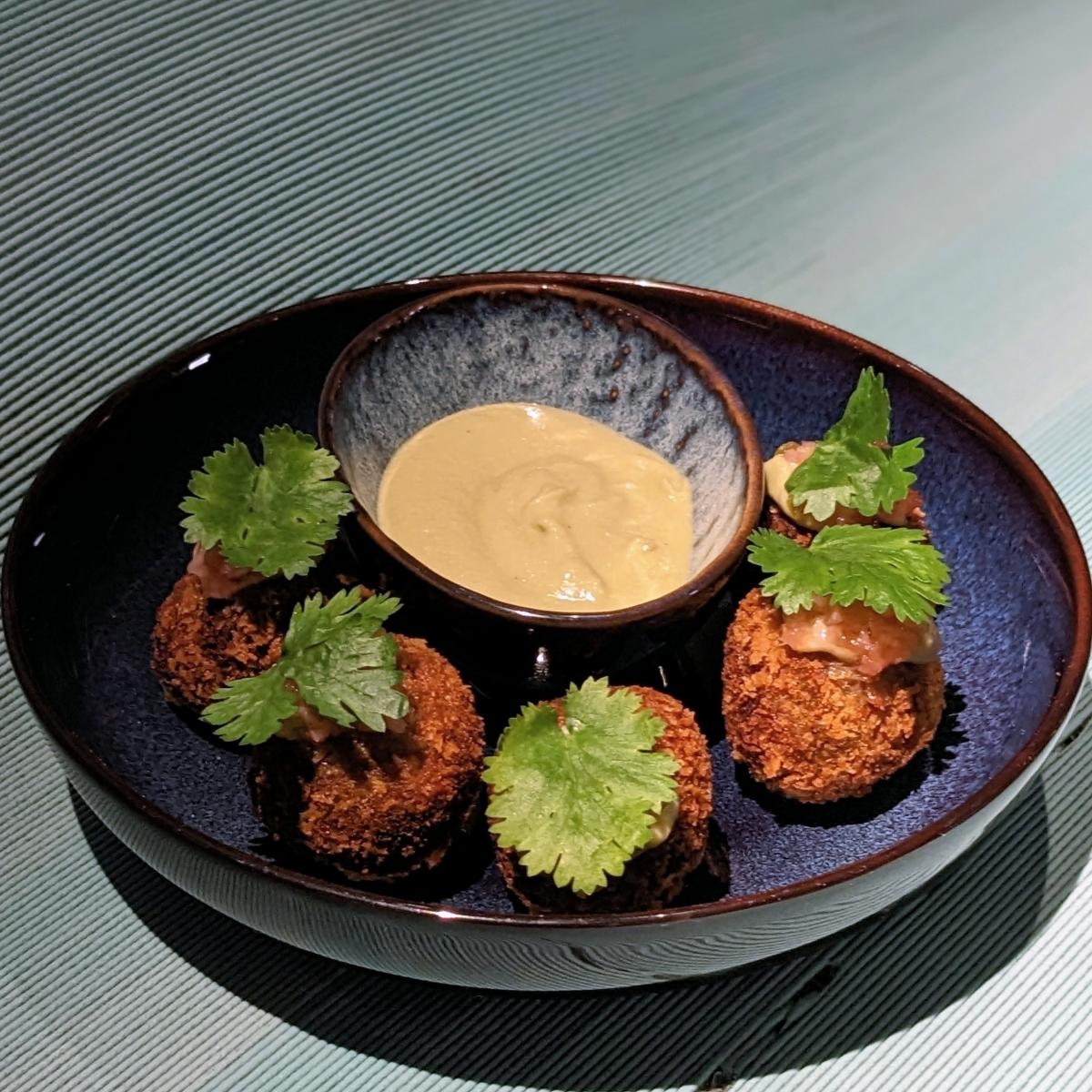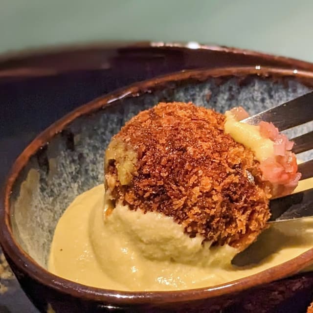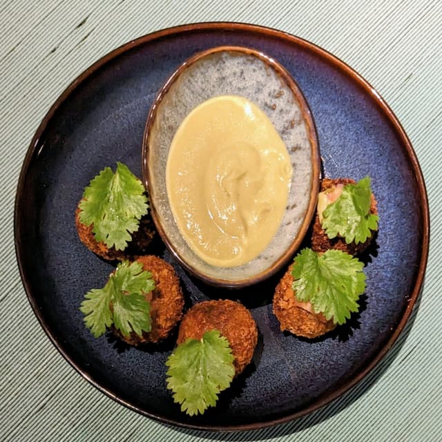 Soy puff and karapincha (i.e. curry leaf) croquettes, a Sri Lankan-inspired dish slightly reminiscent of Middle Easten falafels. Fluffy interior encased in crunchy breadcrumbs, nicely contrasted against the creamy and savoury green pea cashew emulsion dip. 🍛🌿🫛 Swipe right ➡️ for that close-up action shot! 📸 Taste-wise this was right up my alley!! Not to mention the stunning presentation. One of the specials not in the regular menu~ ($12) #sgvegan #wholefoodplantbased #wfpb #minorityowned #zerowaste