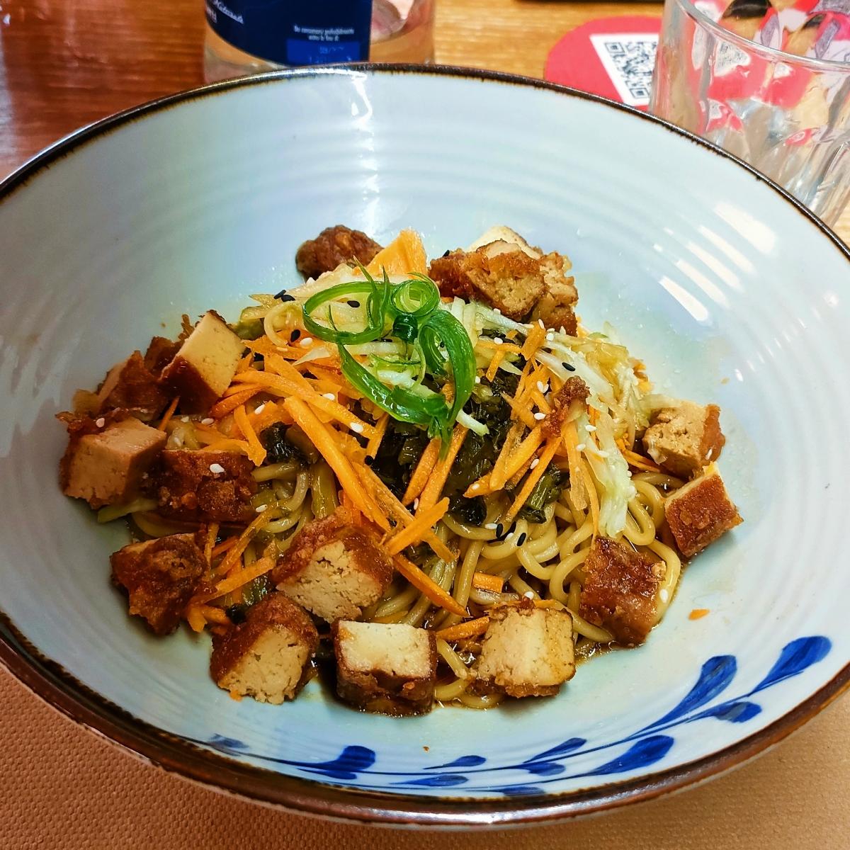 Noodles olio profumato al cipollotto,zenzero e aglio,con tofu fritto al posto della carne.