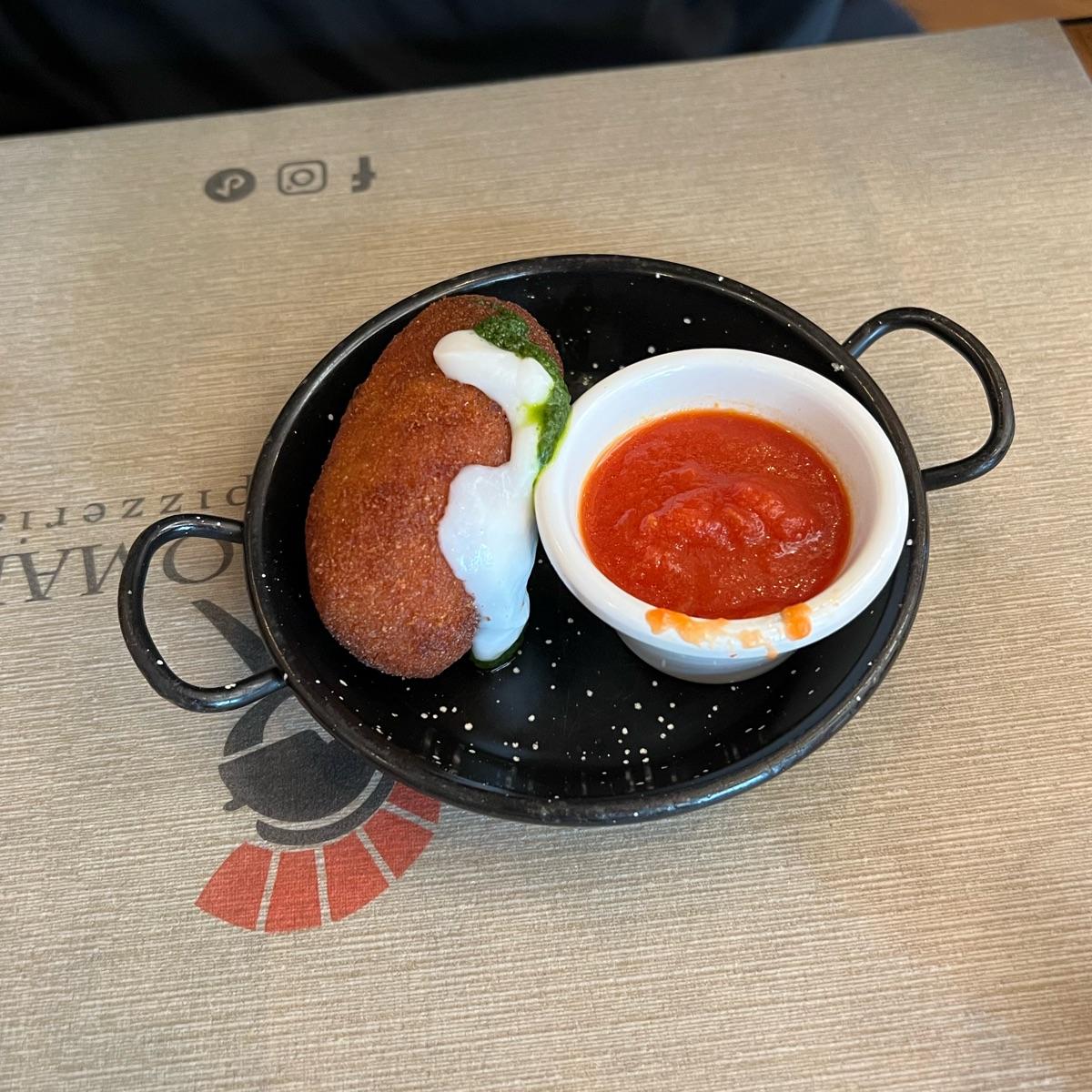 Supplì vegano, molto buono e saporito, con all’interno pomodoro e mozzarella di riso. Prezzo 3€.