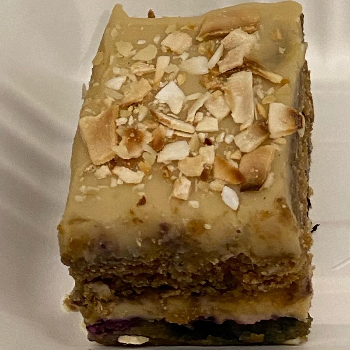 A refined sugar free, gluten free cake. This cake was moist with pops of juicy #blueberries and topped with toasted coconut flakes. The icing deliciously sweet slightly tart and creamy.🍰