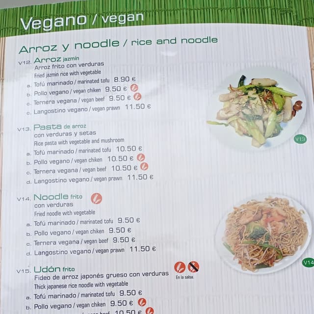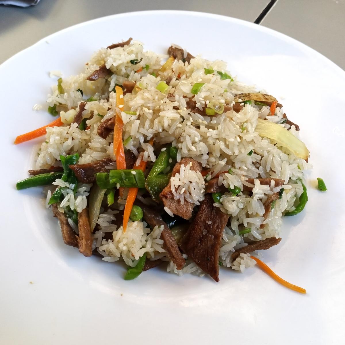 Arroz con verduras "ternera" vegana. Un plato bastante bueno, la no-ternera estaba muy bien lograda. No sé si sería seitán o qué clase de carne vegetal era, pero definitivamente buena. Y sin que un pobre bebé vaca haya sido asesinado y descuartizado.