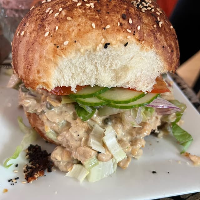 Wow this lemon 🍋 chickpea tuna sandwich on a homemade bun takes chickpea tuna to a whole new level . Absolutely delicious 😋.
