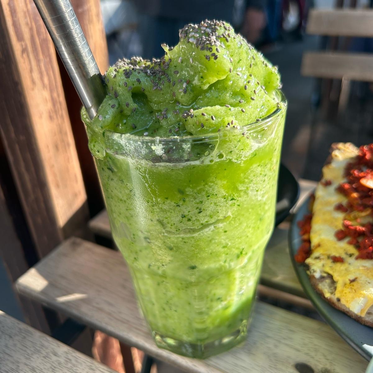 Love this green protein smoothie. It’s made out of orange juice and greens with ice and topped with chia.