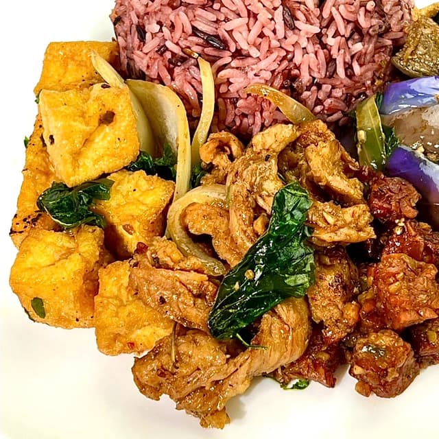 This consisted of pillowy tofu, meaty soy curls, crispy tempeh, luscious melt-in-your-mouth Chinese eggplant, onion, and deeply flavorful basil garlic sauce. Served with jasmine rice. It was fabulous, with a crave-worthy variety of textures, umami-rich flavors, and a satisfying amount of 🔥. (medium 🌶🌶, gluten-free)