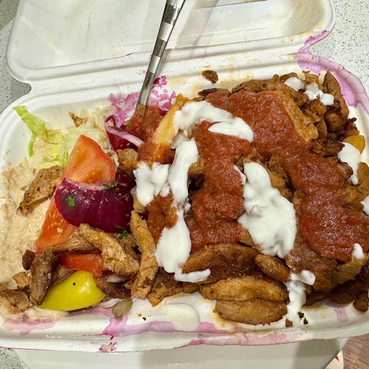 This is listed as Paprika spices chips topped with their signature vegan doner pieces. Comes with a mixed salad of lettuce, onion, tomato, pickled red cabbage, humous, carrot, lemon slice & pickled jalapeno peppers and sauce of your choice (I chose chilli 🌶️ as I love spice and it reminds me of the chilli sauce I used to get at non vegan kebab shops!)
