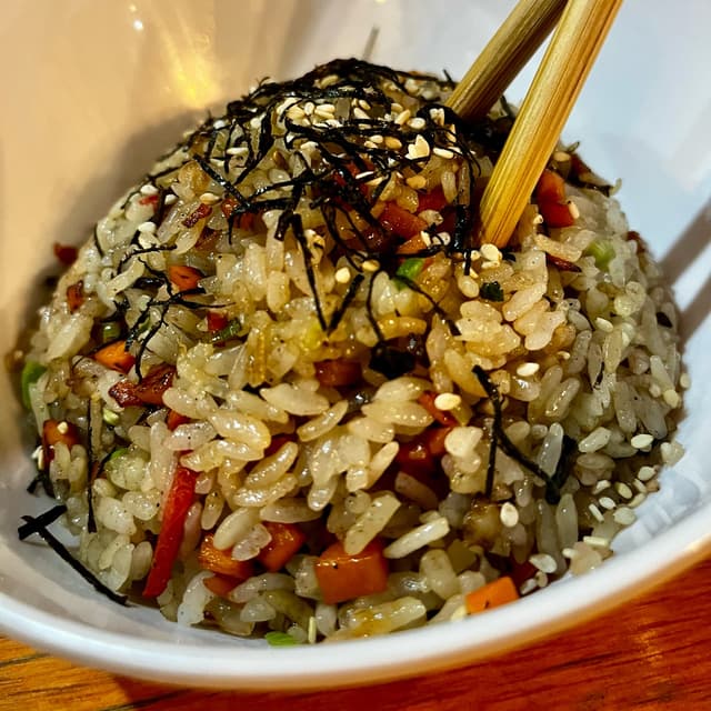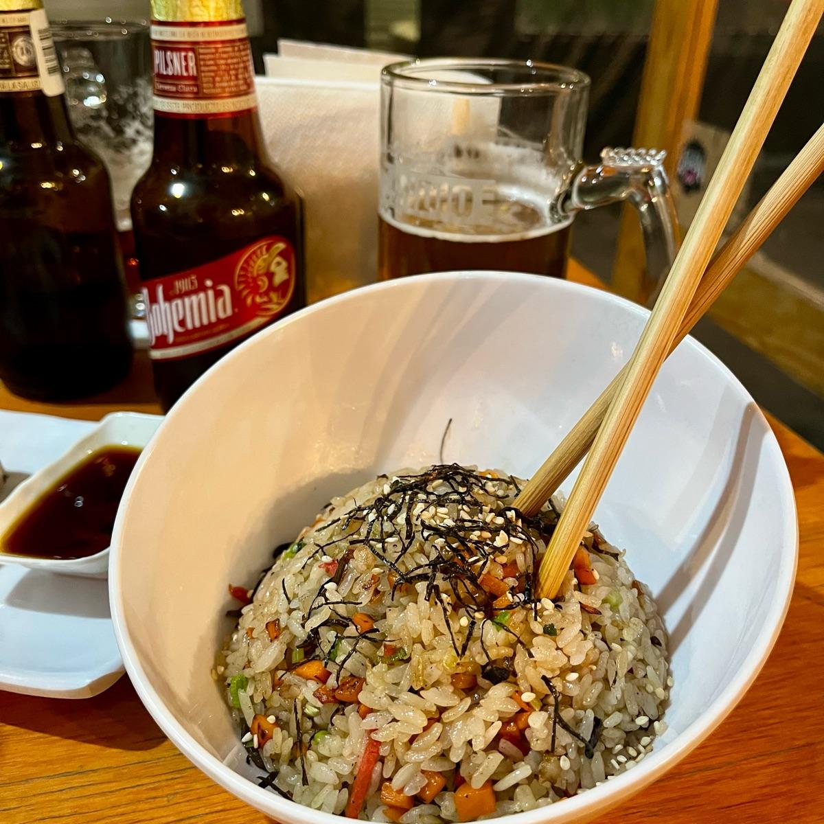 En este lugar hay un menú especial para veganos. Pedí media porción de #yakimeshi de verduras, lo sirven decorado de alga y semillas de ajonjolí, tenia buen sabor aunque he probado mejores. Aún la media porción es bastante abundante, alcanza para 2 personas. Puedes pedir extras como tampico, #tofu o chiles toreados #veganmenu #veganoptions #veganinmexico #goveganfortheanimals