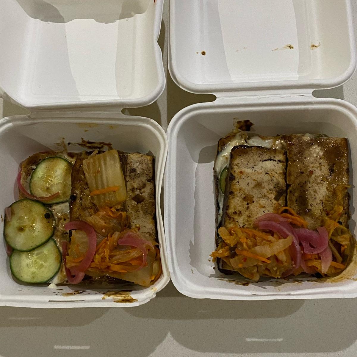 Seared marinated tofu, kimchi,cucumbers, pickled onions,garlic aioli, sesame seeds on toasted sourdough.