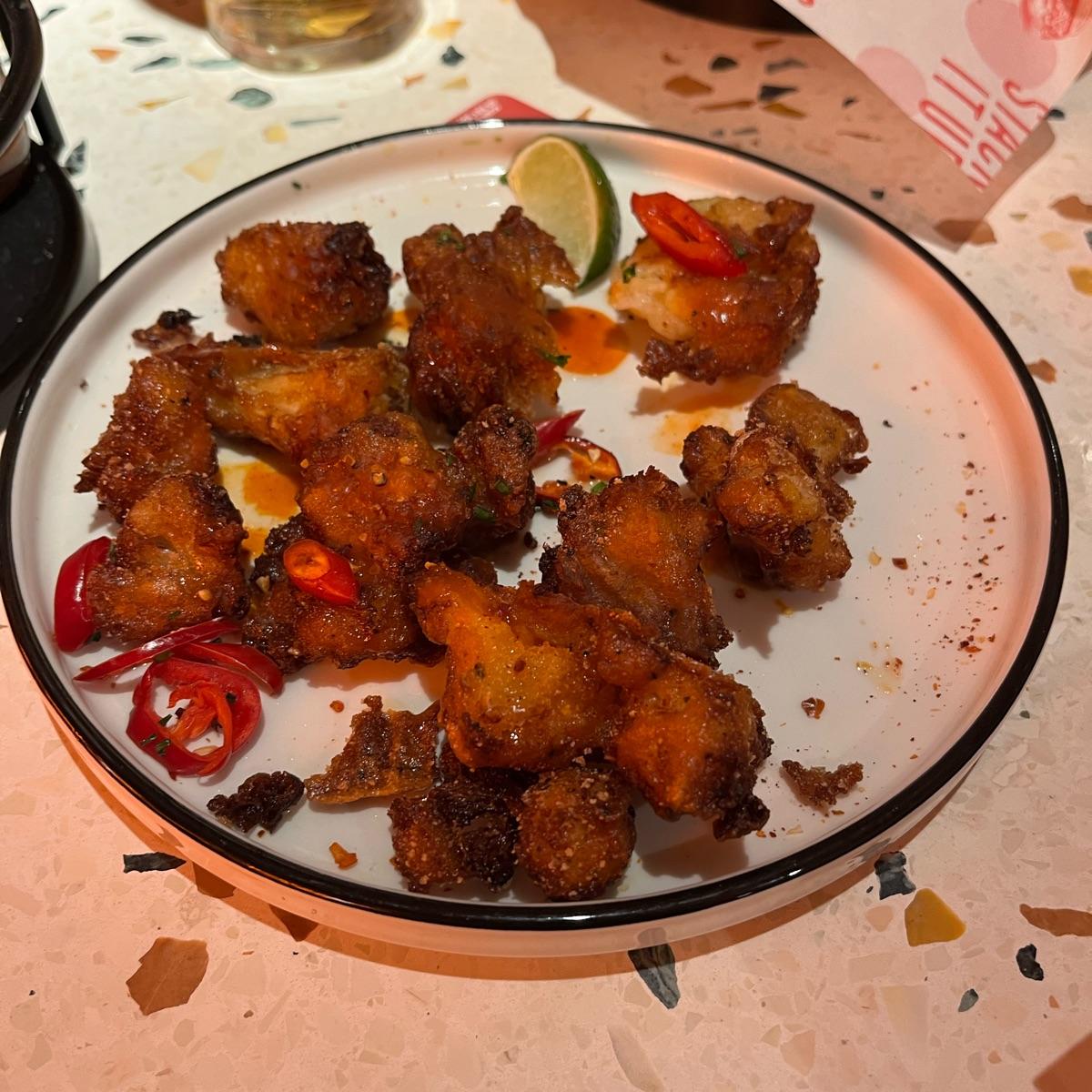 Good starter at this airport diner - very crispy coated cauliflower with a sweet and spicy dressing.