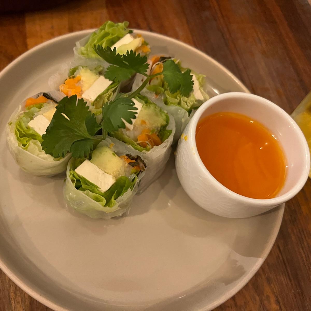 🇫🇷🇹🇭 Love how all the dishes are bursting with #veggies and #tofu. 🫛These are called #springrolls on the menu but I believe they are #summerrolls no? I thought the fried ones were spring. 🤔 Great presentation and love the added #coriander and sauce. Yummy. €7 #veganrestaurant #thai #veganinfrance #paris