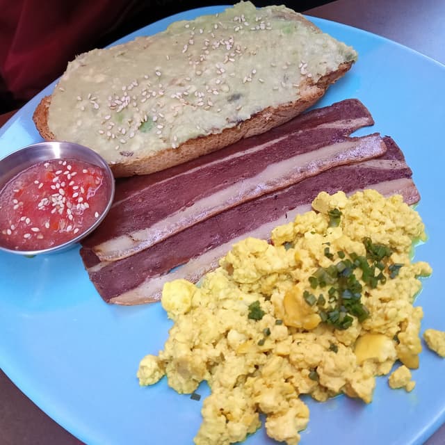 Tofu tipo tortilla, guacamole, tomate y vacon con café con leche por 12,5. El lugar es bastante caro pero supongo que como toda la ciudad... se toman su tiempo en preparar las cosas así que no tirarán de kilos ya preparados, muy rico, buena decoración y música agradable
