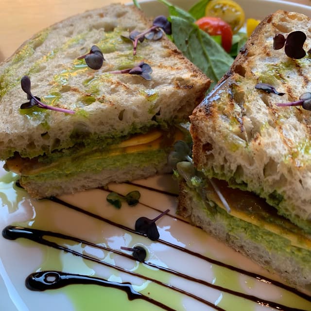 This is a grilled cheese with extras! Melty cheese, caramelised onions, pesto and tofu with a side salad. Yum! Was worth the flight 😆