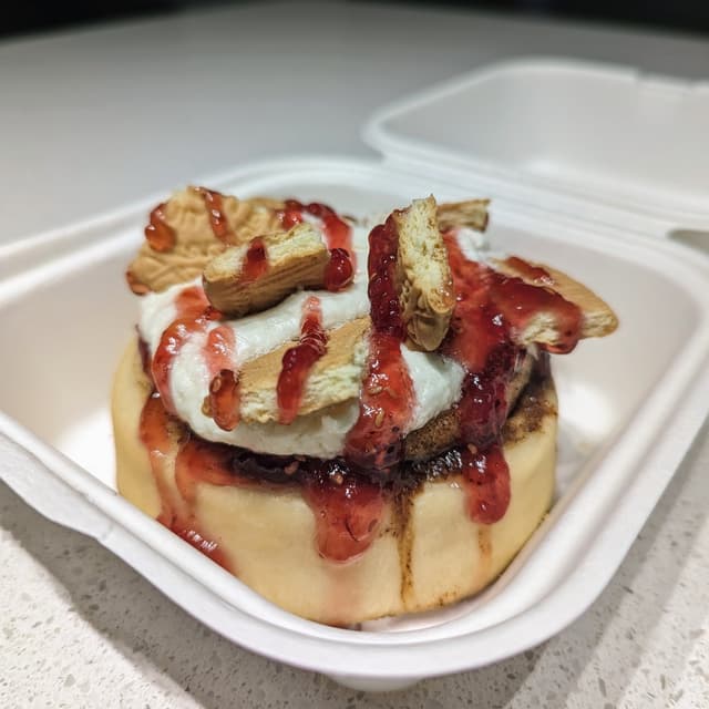 The cinnamon roll has a great, soft texture! It is topped with a smooth cream cheese frosting, graham crackers, and raspberry jam. Super yummy! #cinnaholic #raspberry #vegandessert