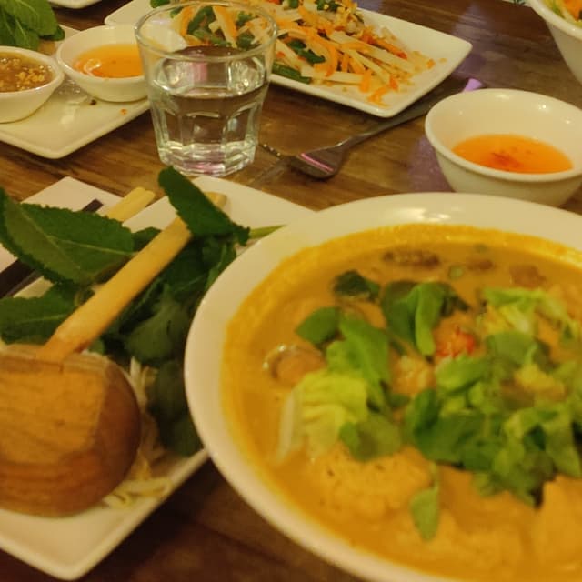 Warm and wholesome and great portion-size. Had a yum coconut milk base, tofu was good, mushrooms could have been better. Also in frame is the lotus stems starter, which was quite nice as well.