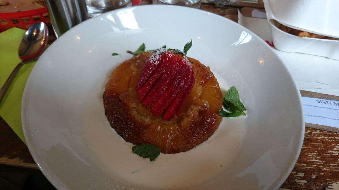 Golden syrup sponge with pineapple, single cream, strawberry and mint. Very filling! #newarc