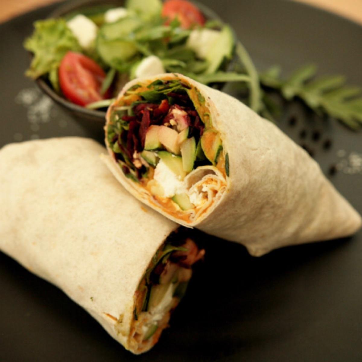Coconut wrap filled with roasted butternut chunks, grilled courgettes, grated beetroot, chickpeas and dressed with our home-made Thai style roasted bell pepper and tomato sauce. #veganisnotscary