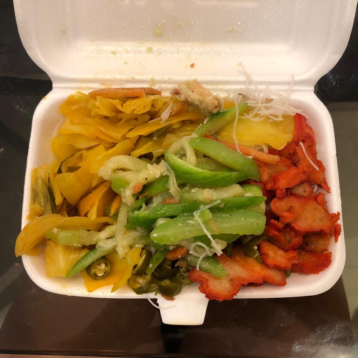 Messy goodness. Gotten curry veg, mock char siew and some sort of melon i think. Not sure what is it called. So flavorful.