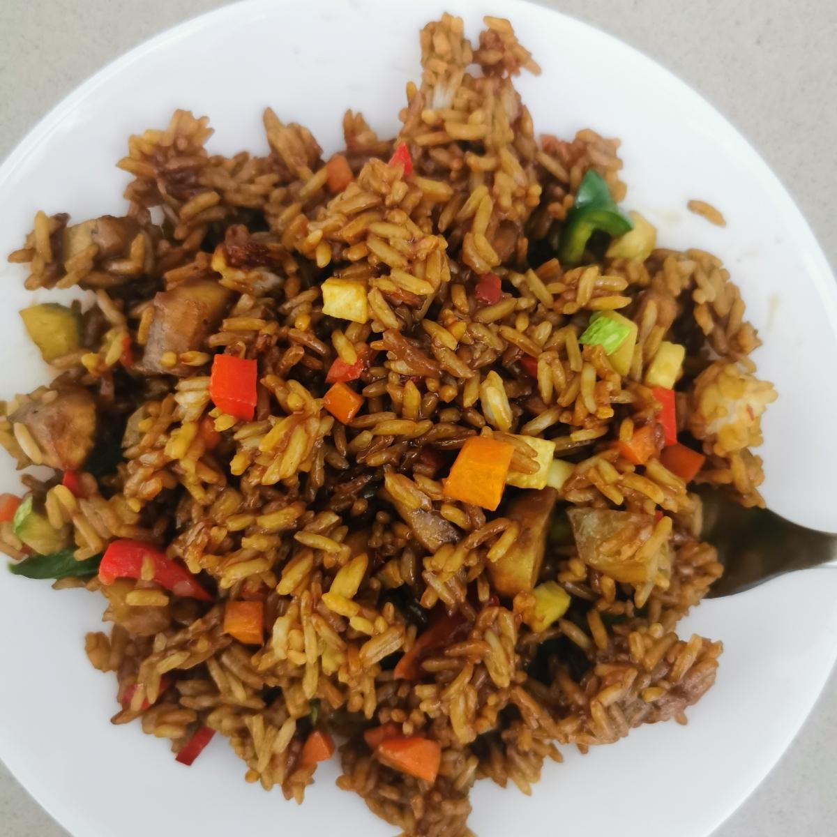 Arroz Jazmín. Wok de verduras. ⚠️Plato Veganizado. El original lleva carne. El sabor es espectacular, el arroz en su punto. Me gusta que si lo pides para llevar el recipiente es de cartón y no de plástico. 👌