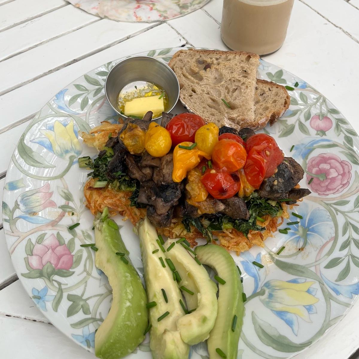 I enjoyed this breakfast as it was flavourful. The potato has brown base was stopped with a layer of pesto, mushrooms and glazed cherry tomato. The avo on the side was helpful in breaking down the richness of the dish.