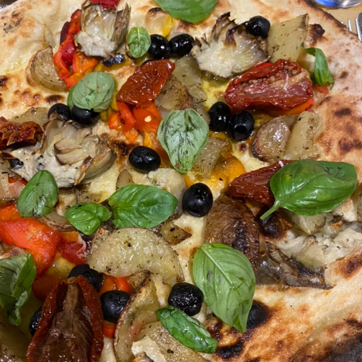 Una delle mie pizze preferite! Da menu completamente vegan, una focaccia con olive, pomodorini secchi, carciofi e peperoni arrosto, patate al forno
