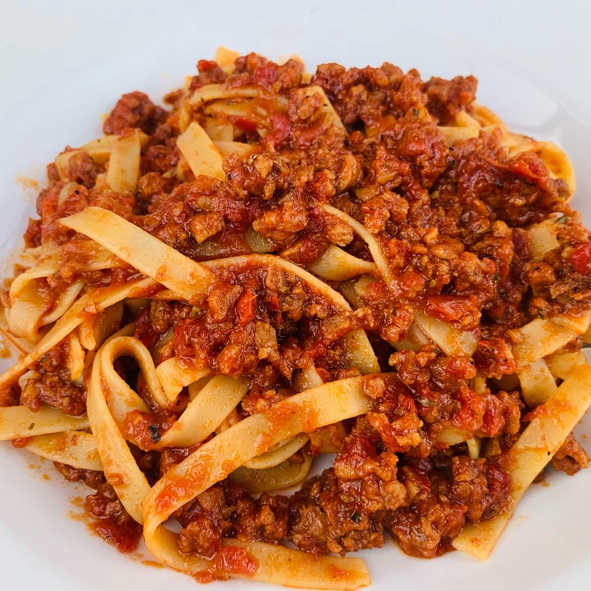 Incredible!! Thick fettuccini noodles with savory “sausage” sauce. Flavorful with nice spice! Easy to order sans cheese. 🍝 #uplandspeak
