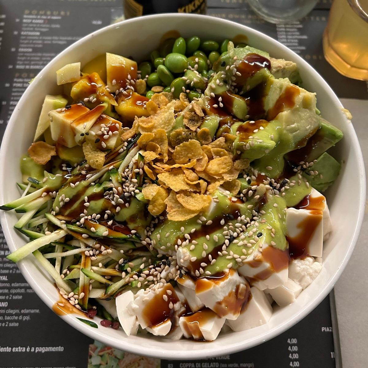 Poke vegana con: mix riso nero e riso bianco, edamame, tofu, avocado, zucchine, semi di sesamo e cereali