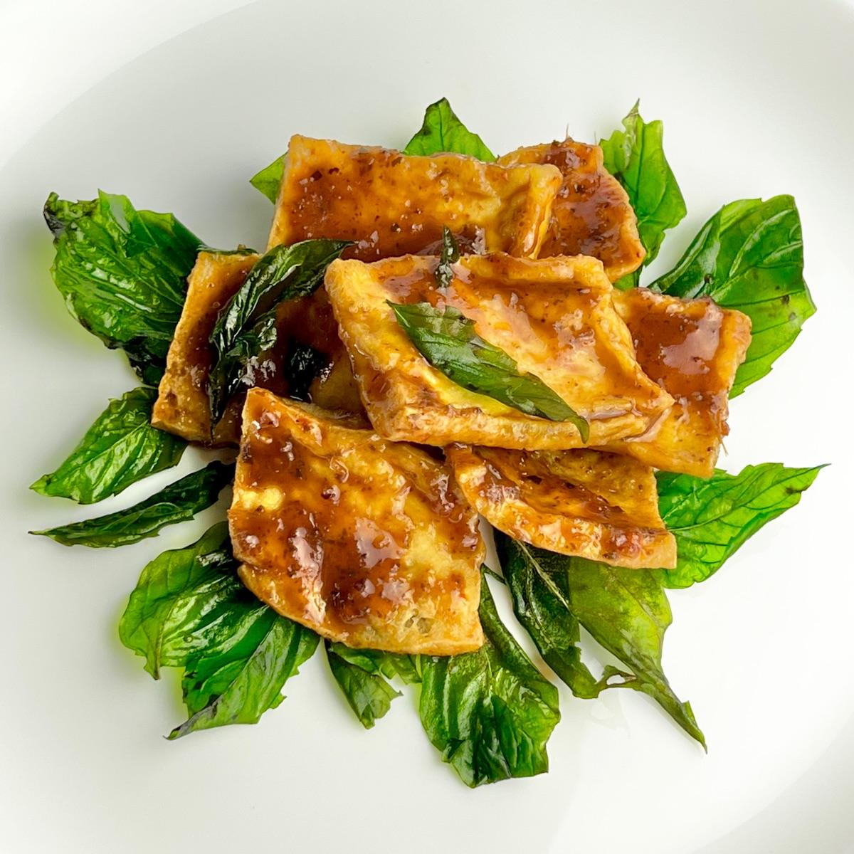 This consisted of crispy fried tofu standing in for 🐥 wings, lively, tangy, and sweet tom yum sauce, and crispy basil. They were wonderfully satisfying.