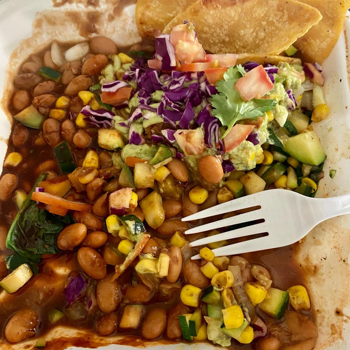 Loved this collection of beans ans veggies! It was rough as take-out—probably should’ve eaten there to be less messy. Corn tortillas soak fast. This was an oasis in our travels! 🥑