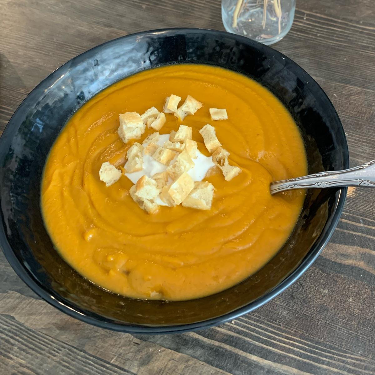 Delicious soup from Café Muscade, a thick #sweetpotato base, balanced with miso, and some #coconut cream and home-made croutons. Quite nom-nom. Take advantage of their soup & sandwich combo!