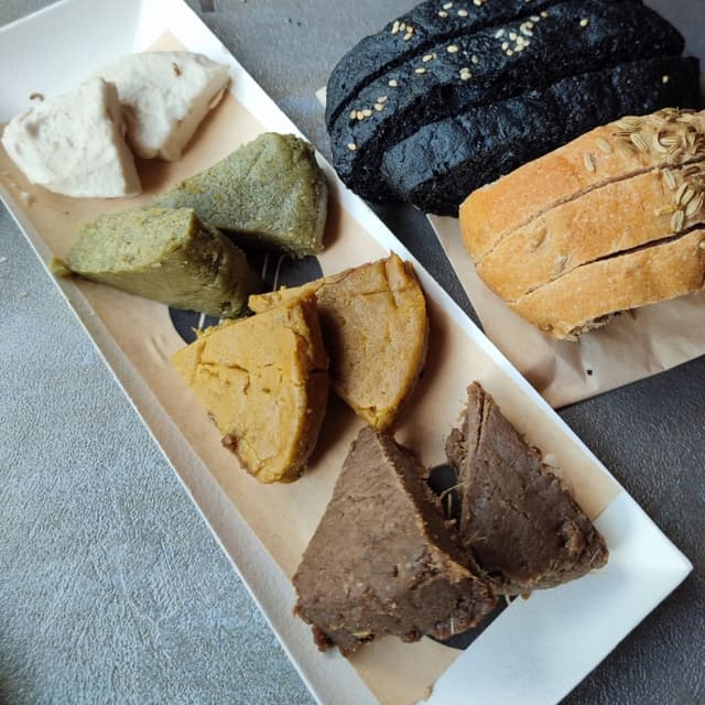 Allora, recensione un po' sofferta. Dietro questi formaggini c'è un grande lavoro sia manuale che di ricerca di equilibrio di sapori e consistenze, questo lo abbiamo apprezzato moltissimo, allo stesso tempo però dobbiamo ammettere che il risultato finale non ci ha convinti del tutto. I formaggini proposti variano spesso, noi abbiamo provato: brie di anacardi, che in realtà ha poco a che vedere con un brie perché non ha crosta erborinata e la consistenza non è cremosa ma pastosa, comunque sapore buono; caprino di noci macadamia con aglio nero fermentato, miso, semi di basilico e carciofi, sapore così così; caprino con zucca, curry, shiitake, crema sapida fermentata, molto sapido e si sentiva quasi solo il curry, abbiamo fatto fatica a finirlo; gruviera stagionato di mandorle con miso e maggiorana essiccata, buono ma si sentiva solo la maggiorana molto forte. Insomma si fa il richiamo a tanti nomi di formaggi che dovrebbero avere diverse consistenze, invece sono tutti identici di consistenza pastosa quasi spalmabile, e cambia solo il sapore, che spesso è troppo stravagante per essere apprezzato. Contenti comunque di averli provati, ma direi che non li riprenderemo. Buono il panino di accompagnamento al carbone vegetale, ed a che il miele di tarassaco (non autoprodotto). Costo 20 euro.