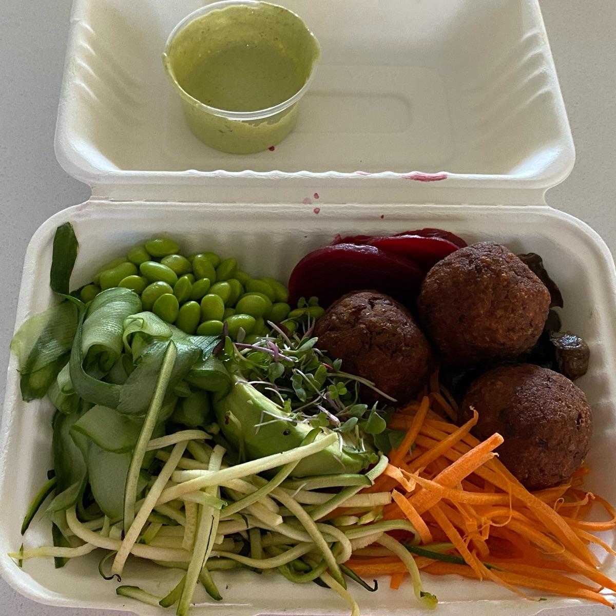 Falafels with zucchini, beetroot, carrots, aubergine, avocado and Edamame beans.