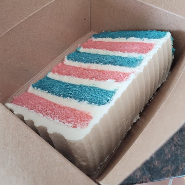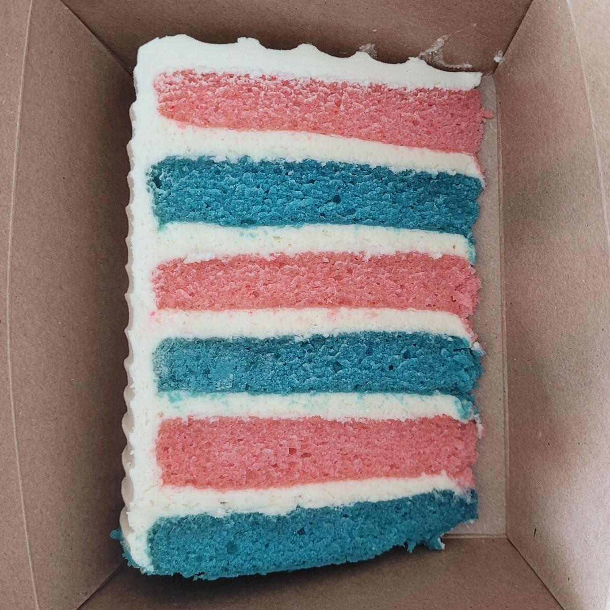 Six layers of #vanilla cake tinted in the colors of the trans pride flag (pink, blue) filled and frosted with white vanilla #buttercream .