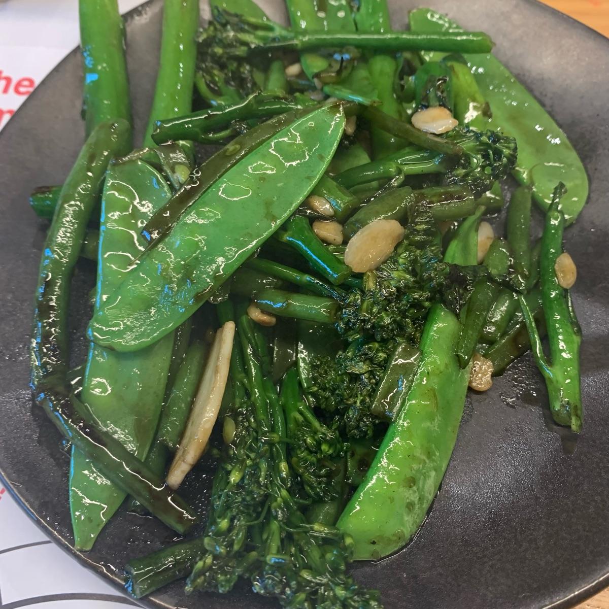 Very tasty greens to go with your ramen or curry. It was nice and crunchy broccoli, fine beans + mangetout that are cooked in garlic + soy sauce.