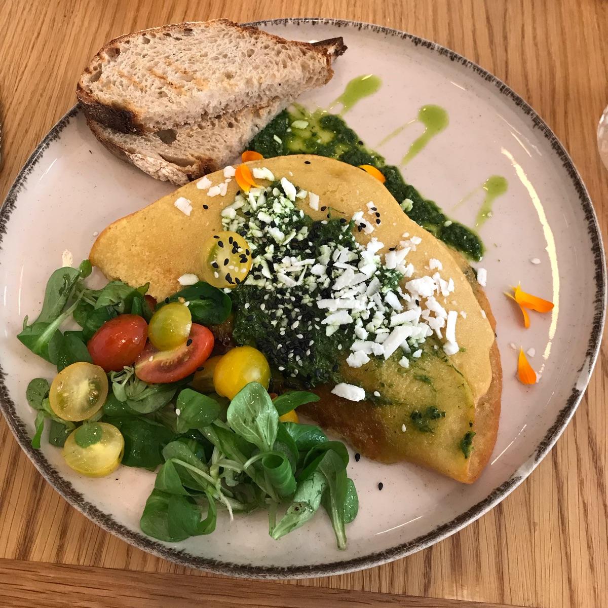 Delicious vegan omelette with excellently prepared mushrooms, tomatoes, vegan goats cheese and more create a cacophony of flavour.