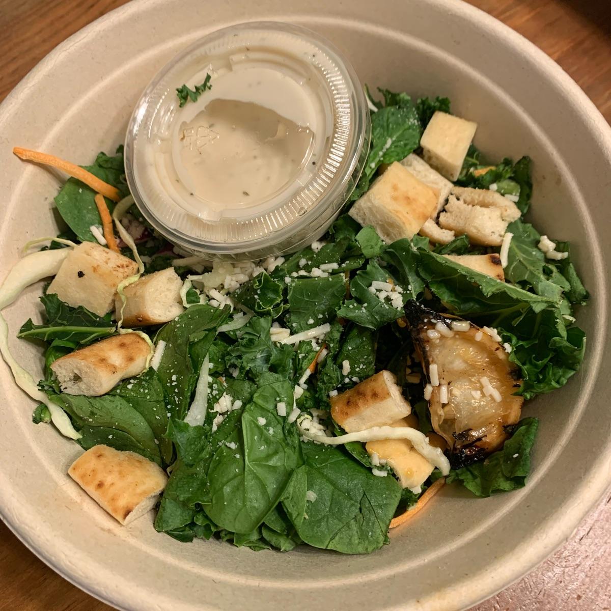 I keep ordering this salad because it’s simple and feels healthy. The caesar dressing is super tasty and they give you plenty of it. You can also order it with a different dressing, like the ranch. Ingredients: Power greens mix of baby spinach, kale, green & red cabbage, carrots, topped with parmesan, flatbread croutons served with Caesar dressing and a grilled lemon.