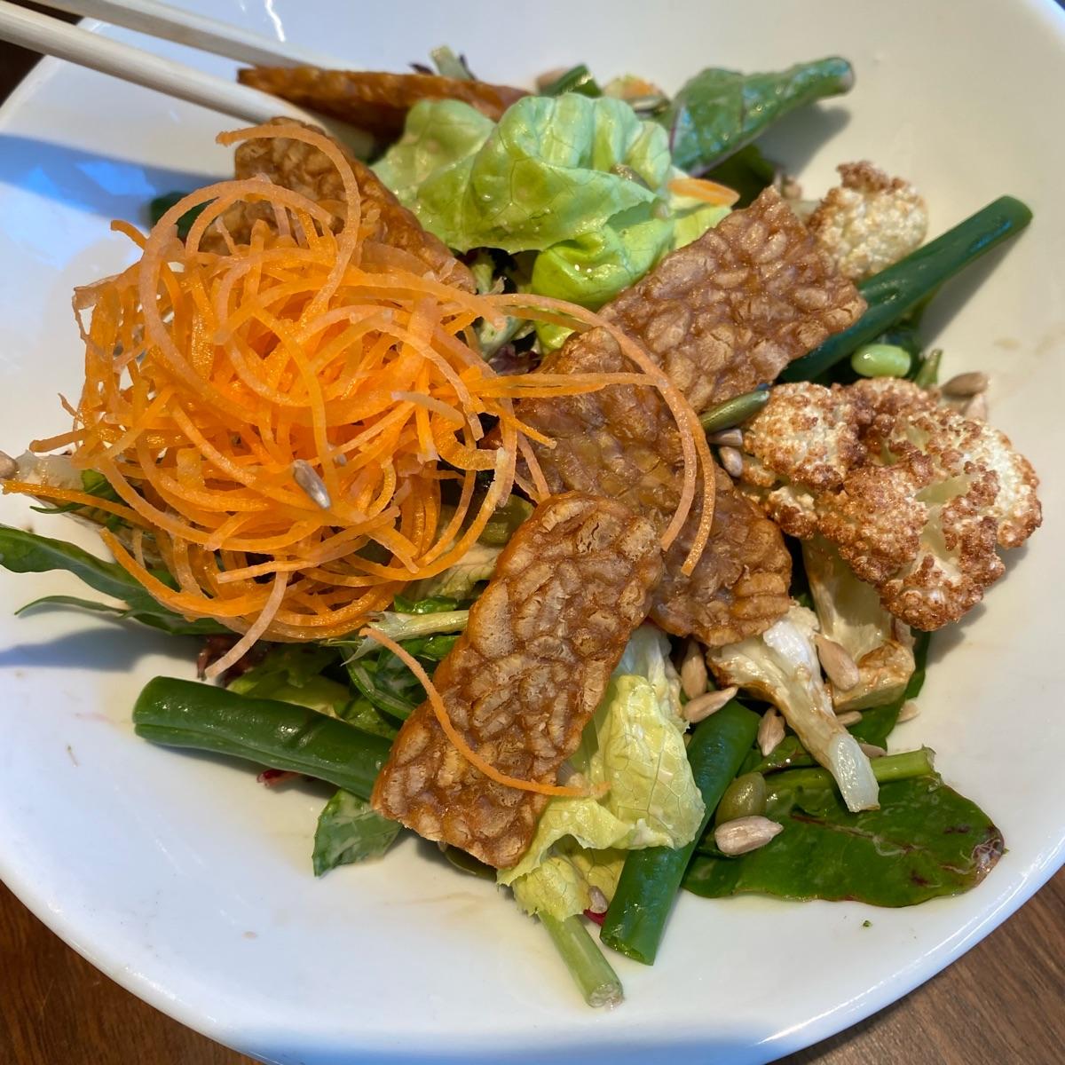 Roasted veg, fresh salad and tempeh in coriander sauce was tasty but small serving.