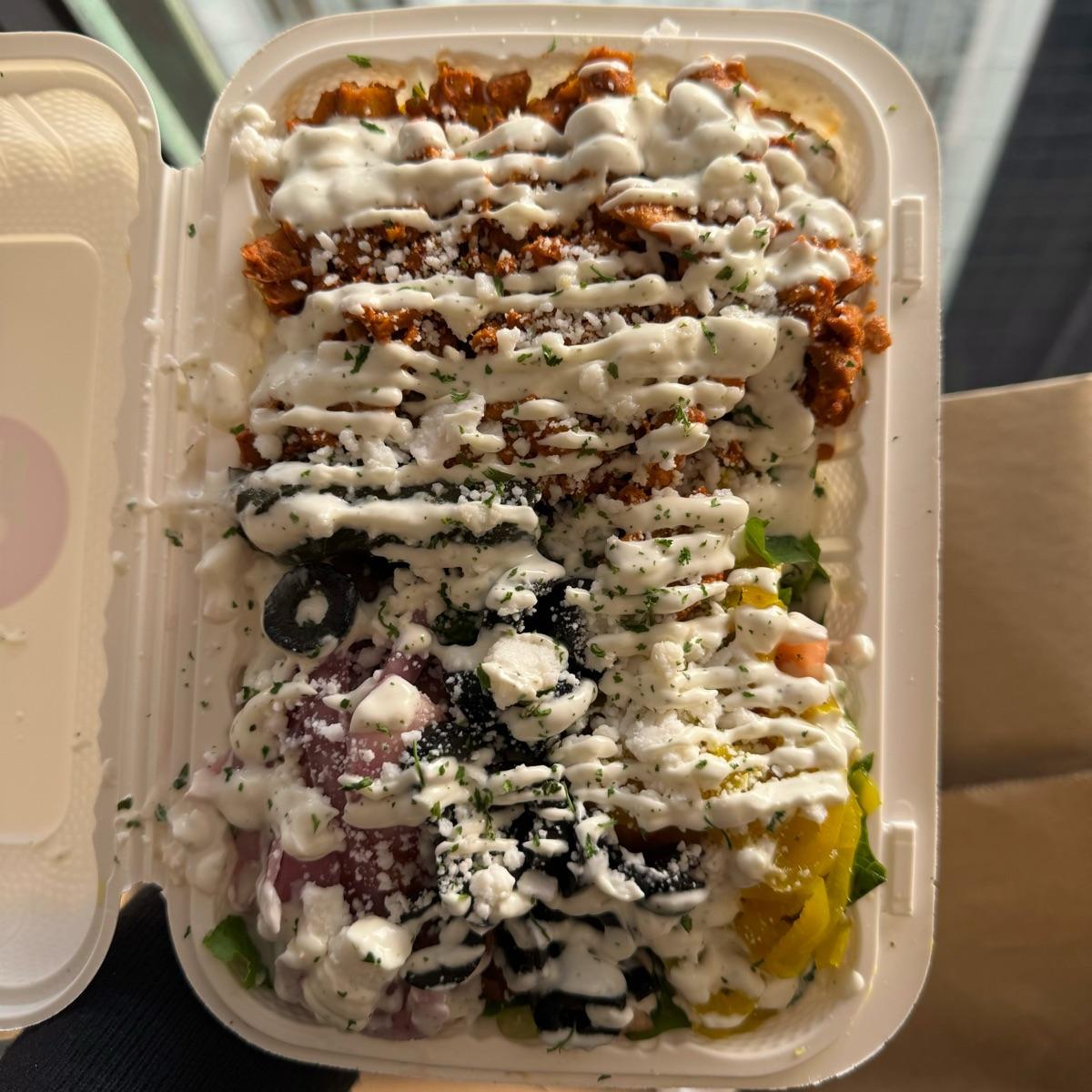 This casual or vegan restaurant really nailed this rice platter. It is reminiscent of the street cart food that you find all of them in Manhattan which unfortunately is not vegan but this is.  This generous portion of delicious rice topped with your protein of choice. (In this case I chose vegan chicken )with a delicious white sauce ,pickled onions, salad all sorts of just delicious goodies. It’s absolutely delicious very filling huge probably could feed two people just try it.